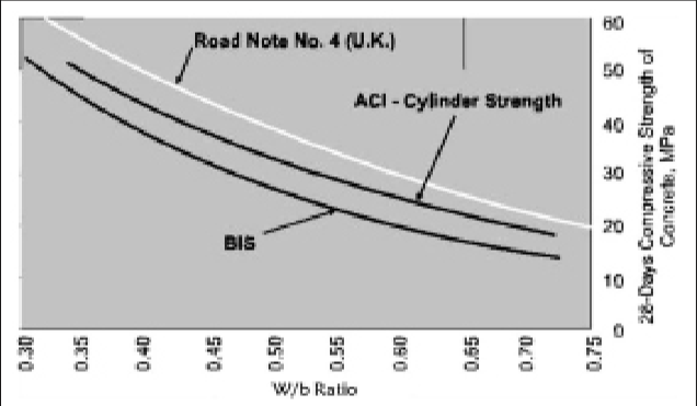 In Fig. 1, from all the three curves [BIS, ACI and Road Note No.4 (U.K.)], it can be noted that as w/b ratio decreases, strength increases.
