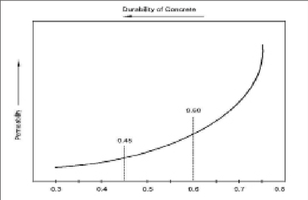 Similarly, from Fig. 2, it can be noted that as w/b ratio decreases, permeability decreases substantially and vice versa. For example, when w/b ratio changes from 0.35 to 0.65, the strength decreases by 63%, but permeability increases substantially by 950 times. Permeability is directly linked with durability; for making the concrete more durable, its permeability has to be kept low, rather the concrete has to be made ‘impermeable’.