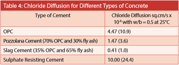 The best way to make the concrete durable is to make it impermeable. GGBS has significant influence in reducing the permeability of concrete. Literature survey indicates that concrete made with slag/GGBS is more impermeable than PPC concrete (concrete with fly ash) or pure OPC concrete (Table 4). The table shows that it is far more impermeable as compared to Sulphate Resisting Concrete (SRC).