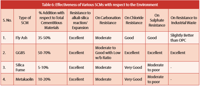 Table 6 indicates effectiveness of various SCMs in resisting environmental hazards.